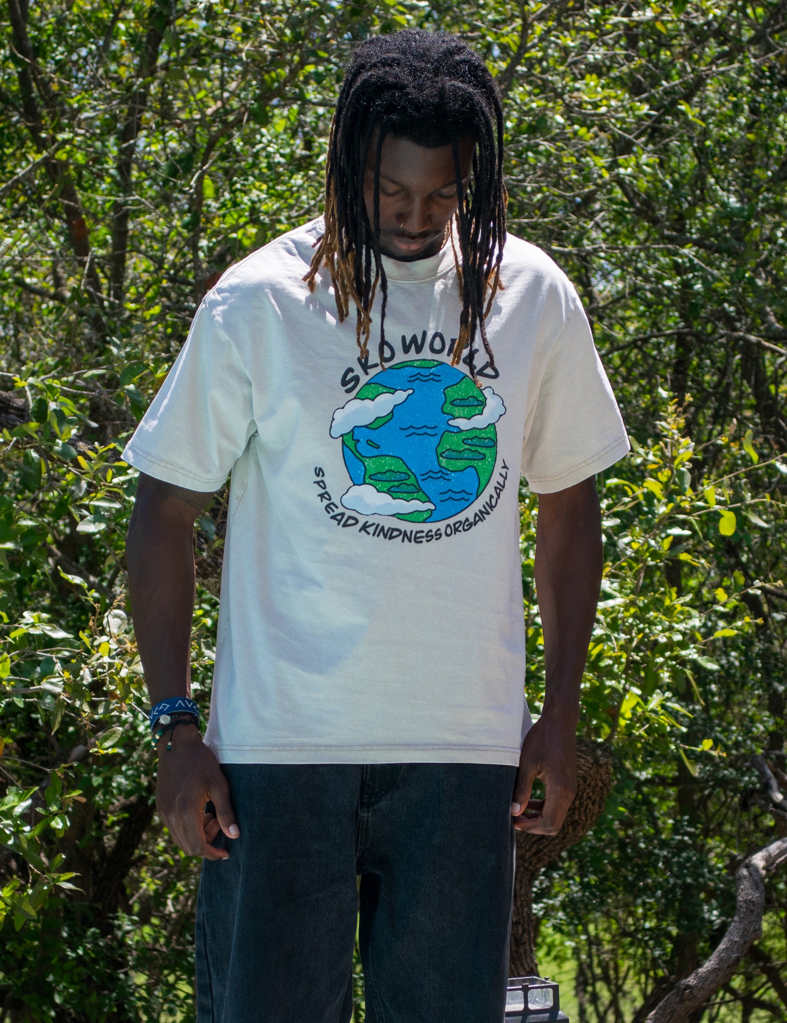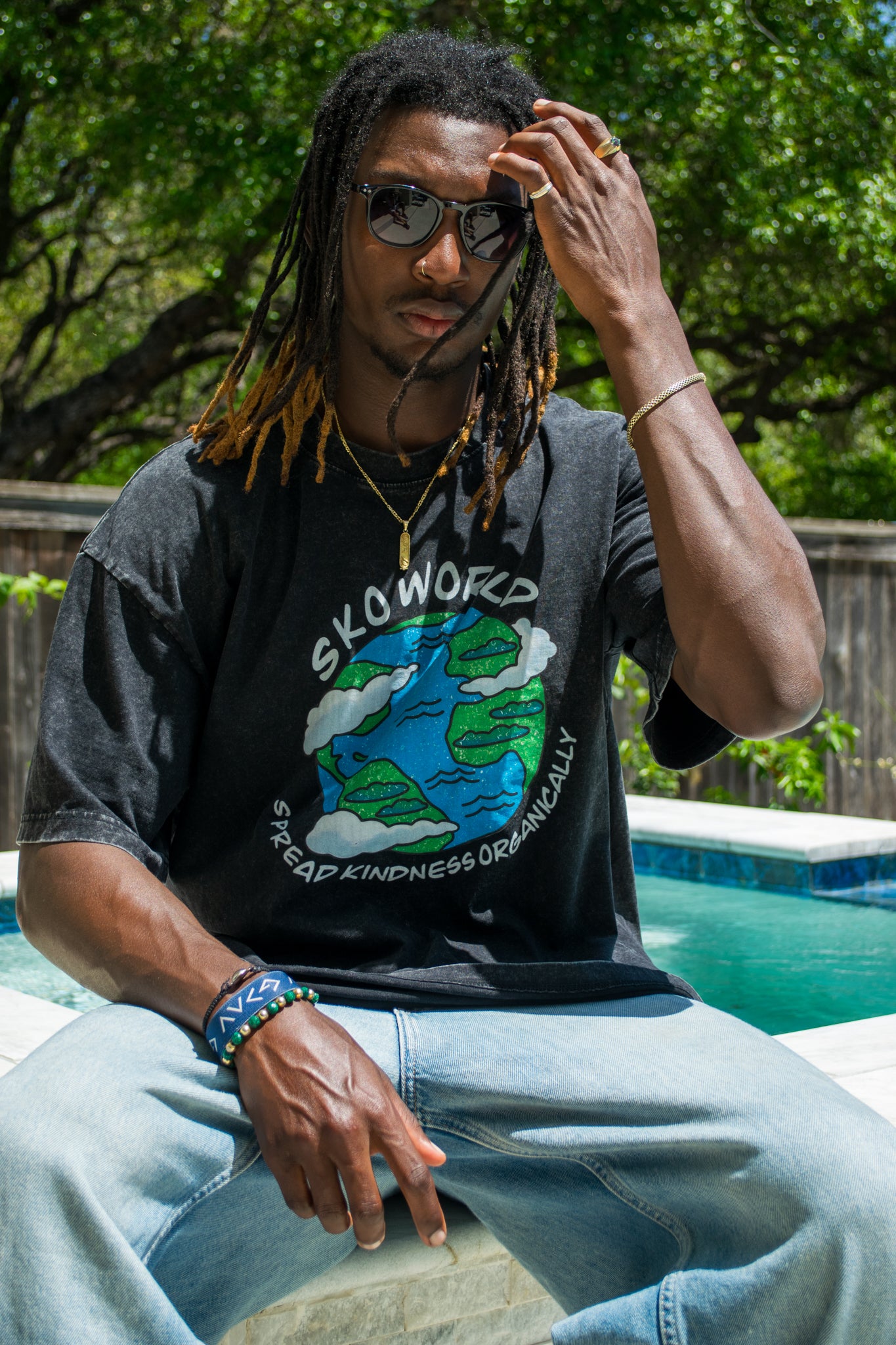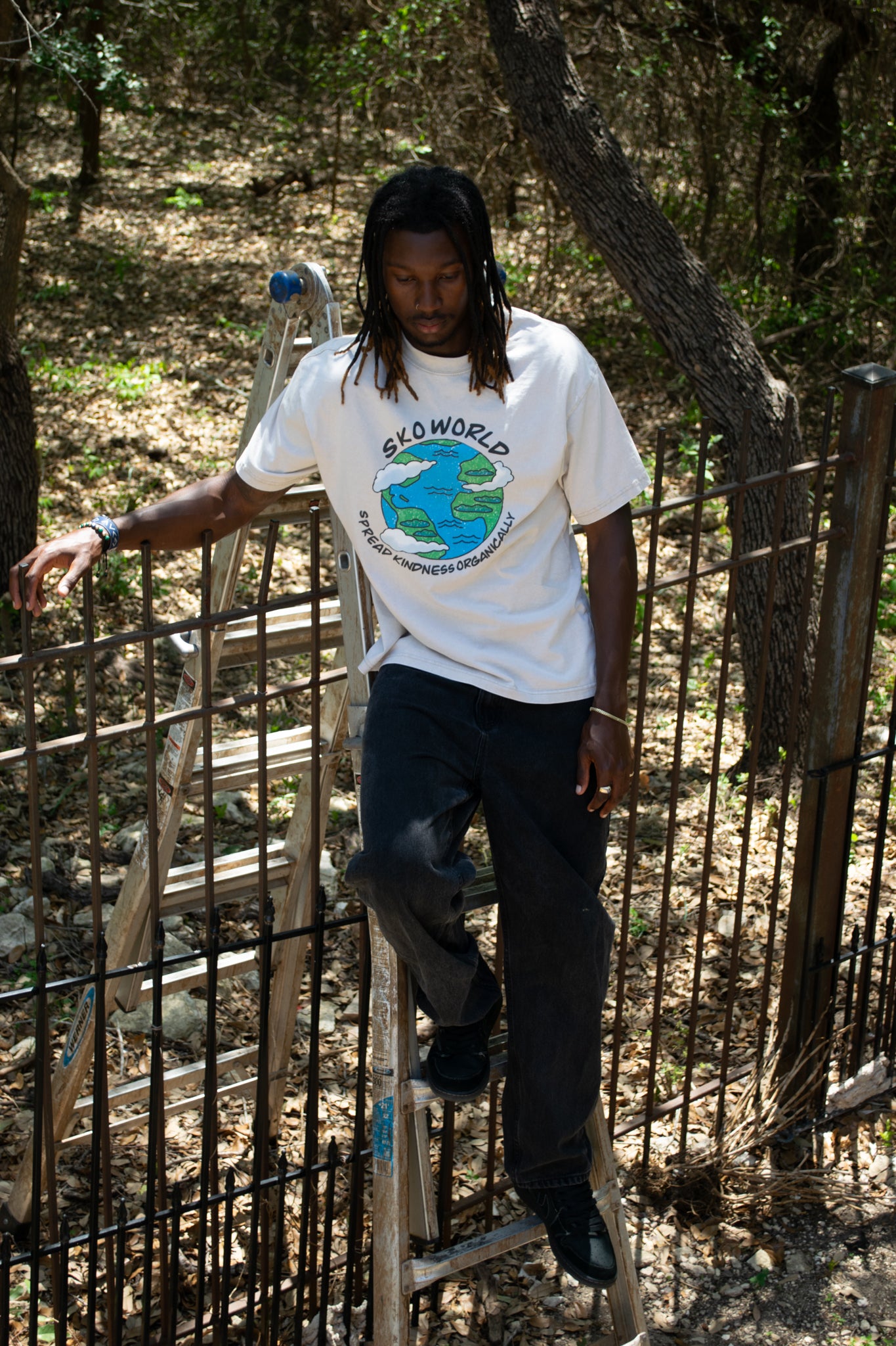 This tee isn't just fashion it's a movement. Made with premium, breathable cotton and stamped with our SKO globe graphic, the World Tee reminds us that kindness connects us all. Whether you're walking the city streets or building a community, this shirt moves with purpose. Available in Beige (L) and Black (XL) for $30. (Sizes worn in photos are samples.)